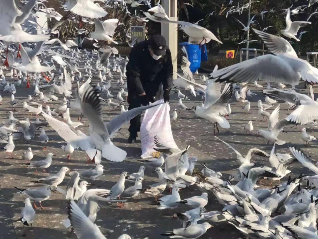 在海埂大坝,防控疫情期间,因为没有游客投喂海鸥,每天早上9点到10点、下午4点劝导员们都要对海鸥进行投喂,而投喂量也从平时的150公斤增加到300公斤。