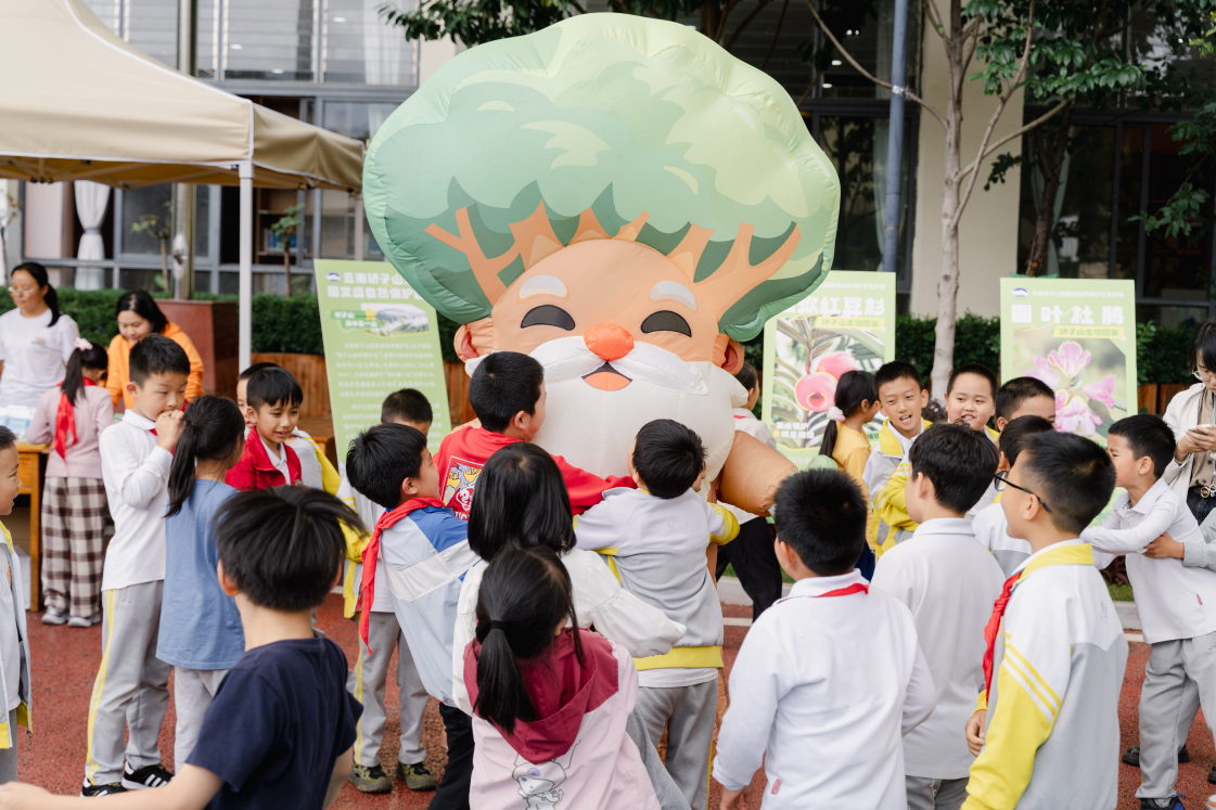 互动区内,“套中啦!”“不带火种进山,属于‘十不做’!”的欢呼声此起彼伏,气氛活跃。同学们全情投入到“圈定生态守护承诺”“生物精灵守护”投壶、“十做十不做”沙包挑战等趣味游戏中,在欢声笑语中边玩边学、边学边悟。昆明市林业和草原局打造的昆明市古树名木文化IP“古树爷爷”与“古树奶奶”惊喜亮相,更是点燃了全场互动热情,将活动推向高潮。在轻松愉悦的氛围中,生态保护理念悄然浸润童心,切实增强了学生们的生态文明意识。