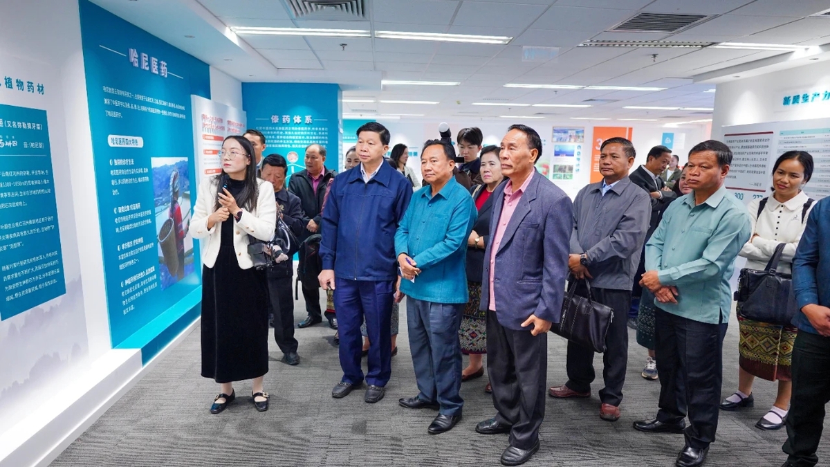 当天,老挝代表团在昆明开启实地参访行程,首站走进昊邦数字医药健康产业园。在特色药材展区,松花粉、铁皮石斛、何首乌、鸡血藤等中老两国共有的天然药材吸引代表团驻足,这些跨越山河的"自然瑰宝"成为双方人文与经贸交流的亲切纽带。“通过实地参观,切实感受到了云南民族医药的独特魅力,丰富且极具特色的民族医药成果让我印象深刻。”南塔省委副书记、省人民议会主席坎丰·因玛尼说。